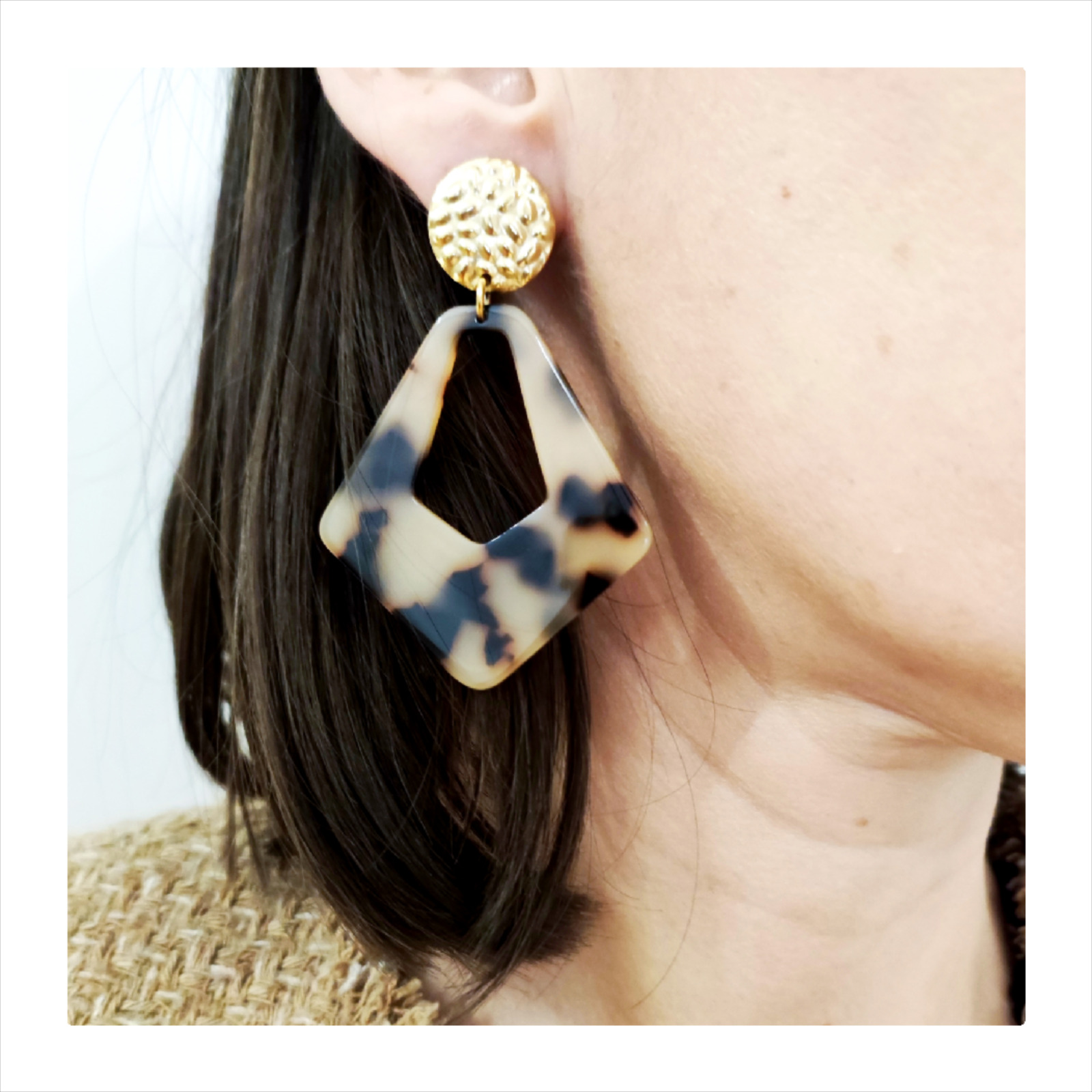⭐︎ boucles d’oreilles acier inoxydable + résine ⭐︎ Hauteur totale : 6.5 cm ⭐︎ Couleur doré