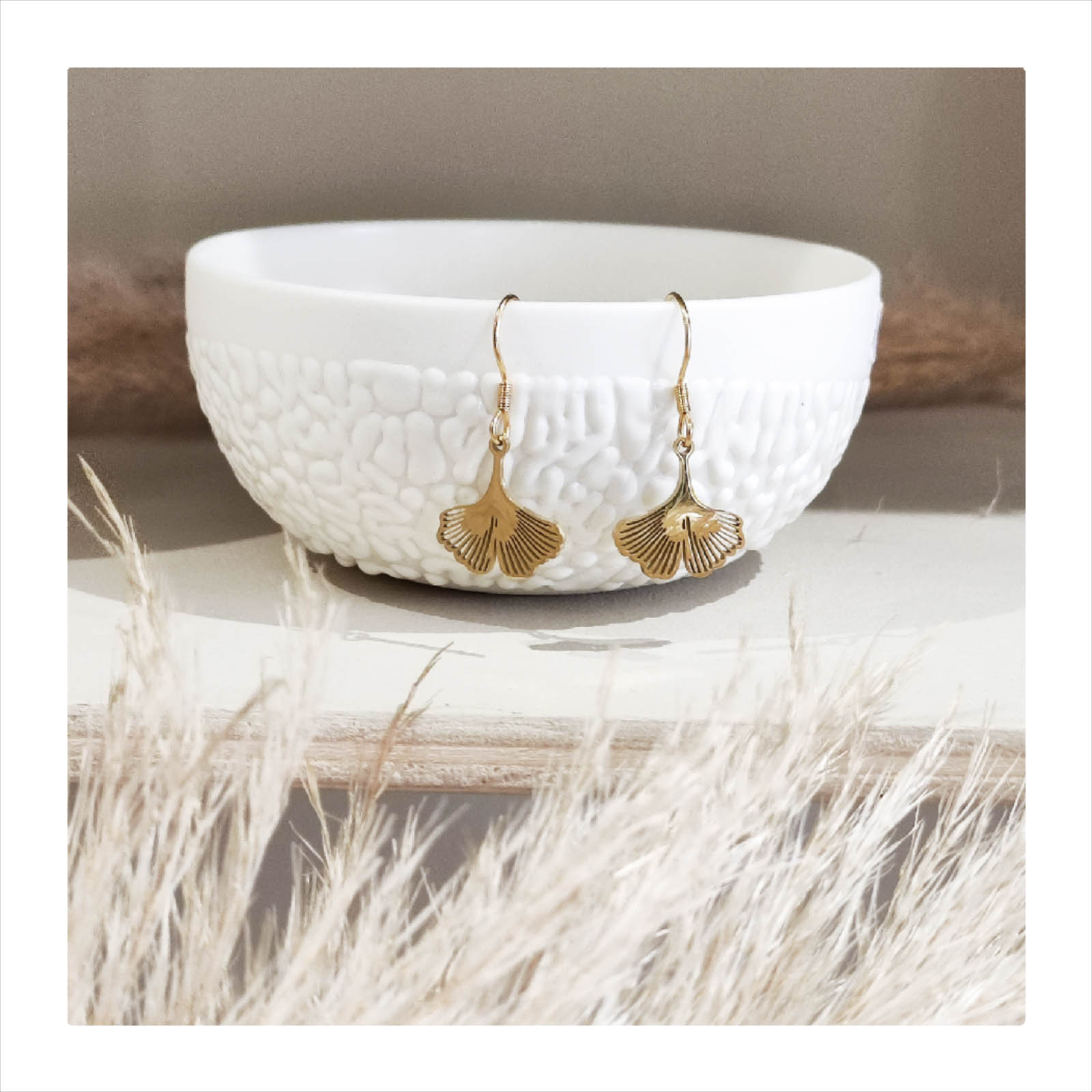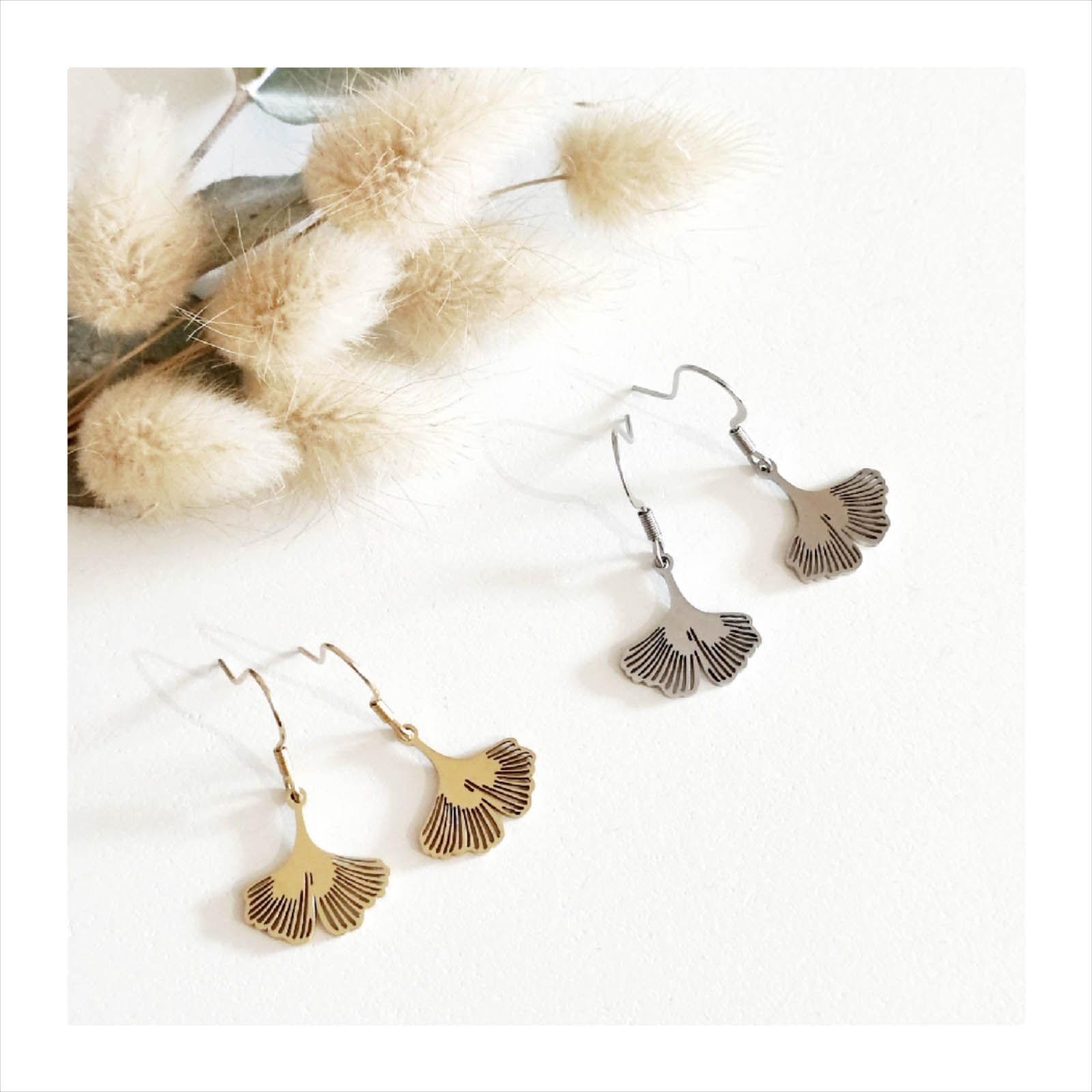 Une jolie feuille de ginkgo ressemblant à de petits éventails … Un modèle très léger, sobre qui s’adaptera à toutes vos tenues !