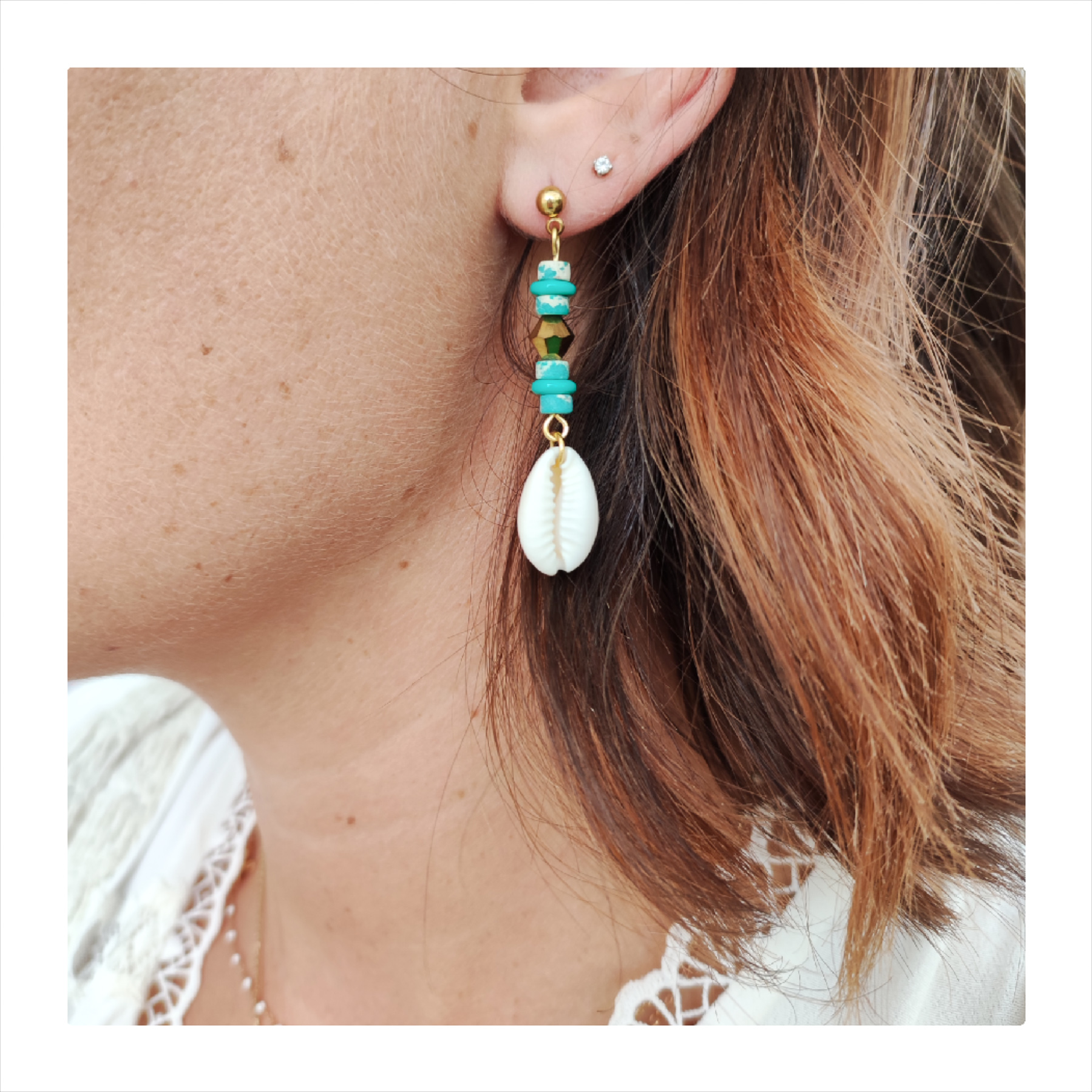De jolies boucles d’oreilles aux notes estivales … Le charme des cauris, qui nous donne un air de vacances !!