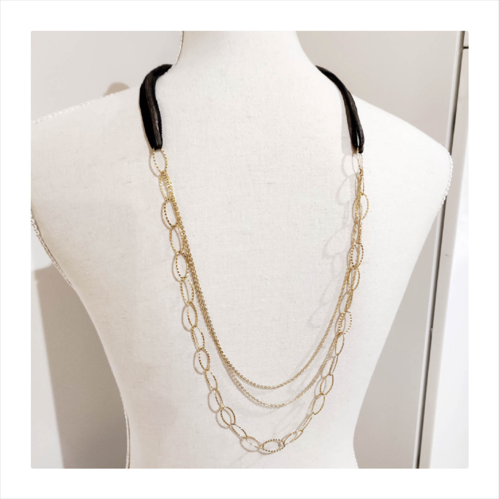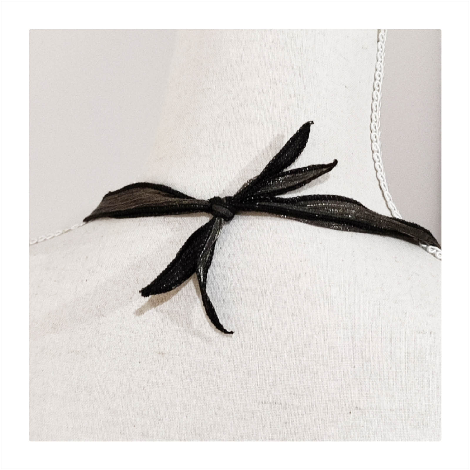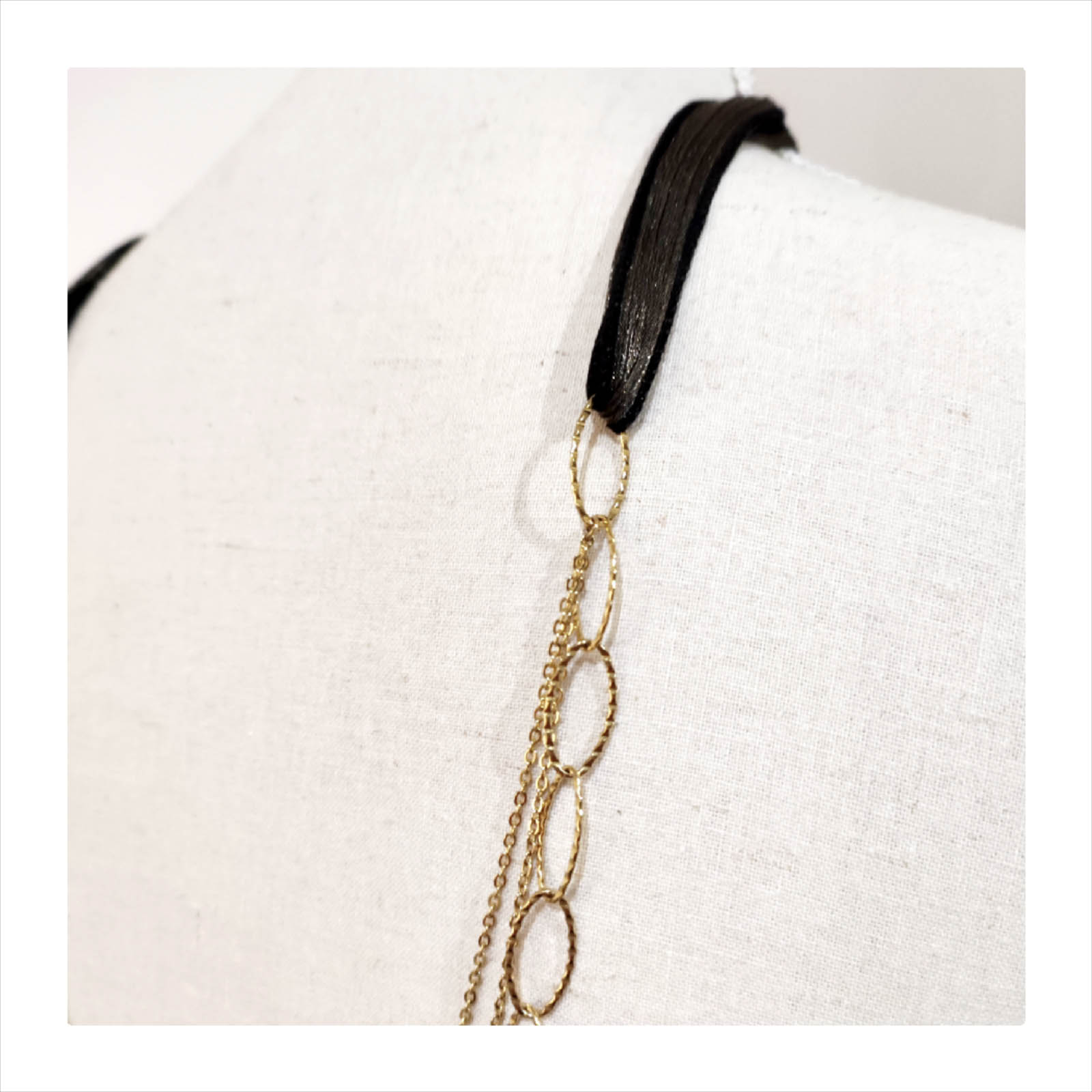 Un sautoir ultra chic sur votre petite robe préférée ou sur un top basique ! Un joli ruban de soie (noir aux reflets dorés irisés) est déjà noué dans le cou. Il apportera de l’élégance à votre tenue …